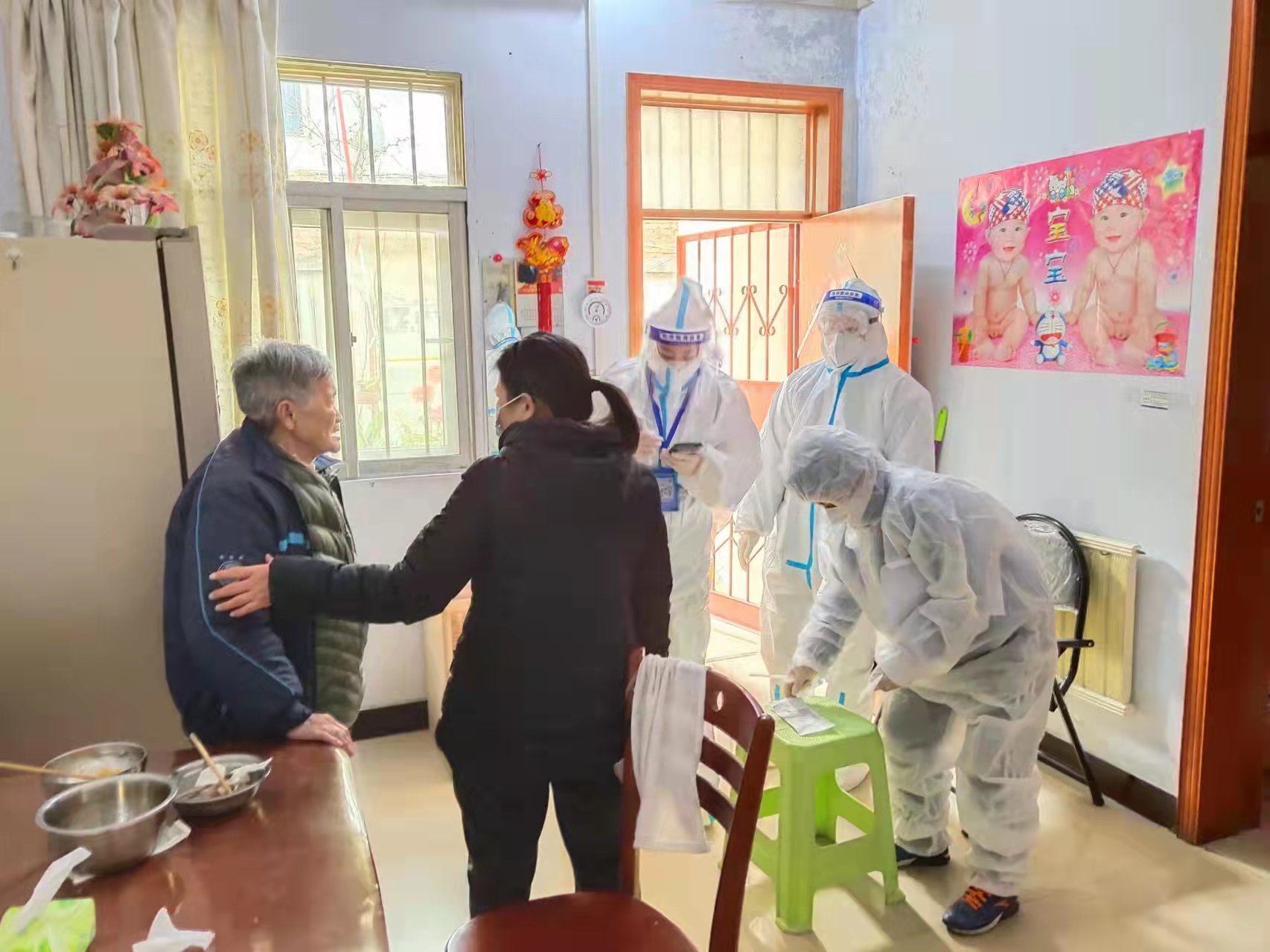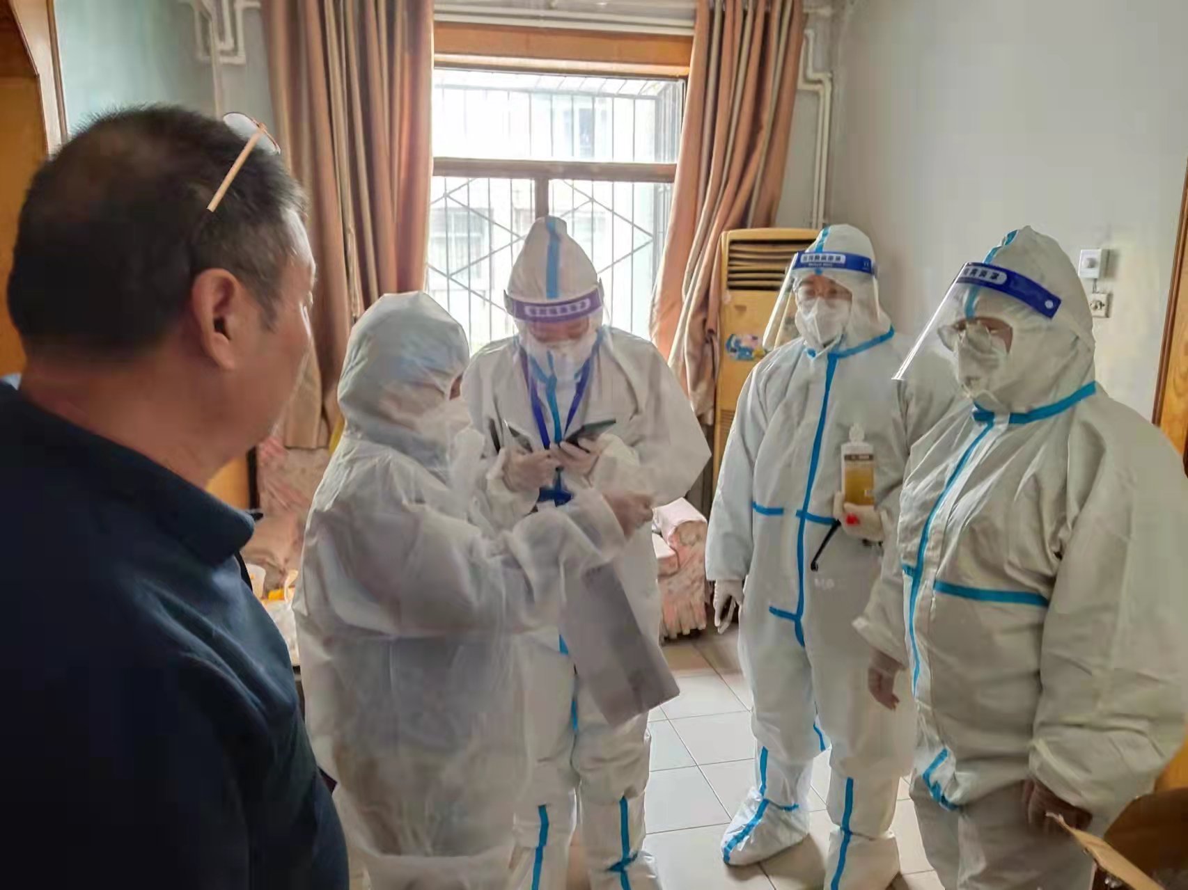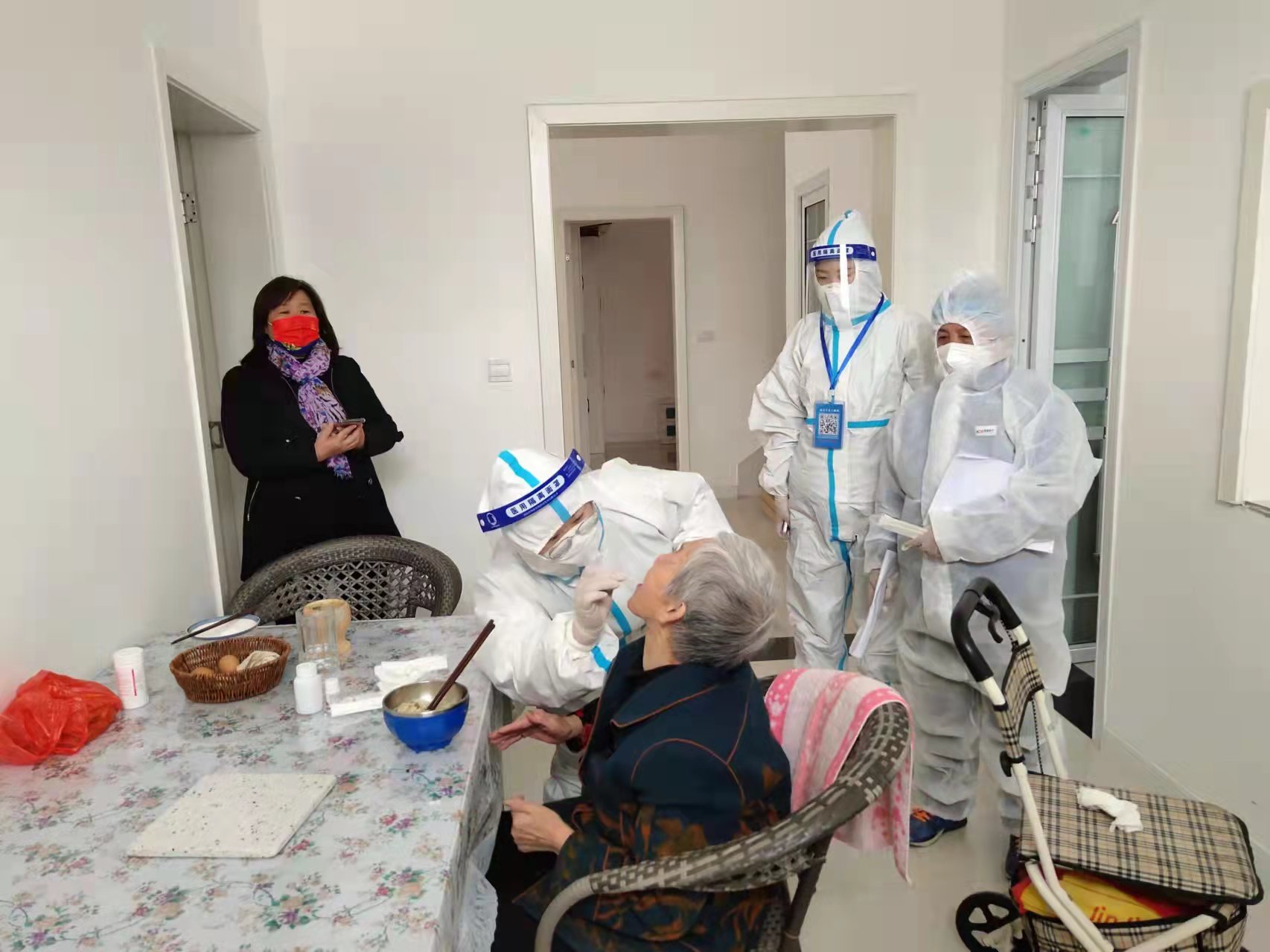 社區(qū)內有不少老年人不便下樓,姬園長和其他團隊成員就一起上門服務,為老年人以及身體不便的病人做核酸檢測。